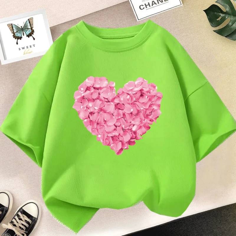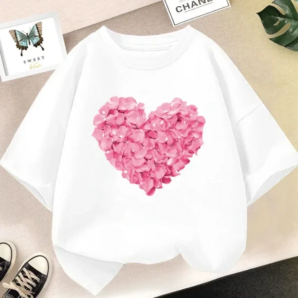 Add a playful touch to her wardrobe with this Pink Heart Flower Print Girls T-shirt. Made from soft, breathable fabric, it offers all-day comfort while featuring a cute and colorful design perfect for casual outings and everyday wear.